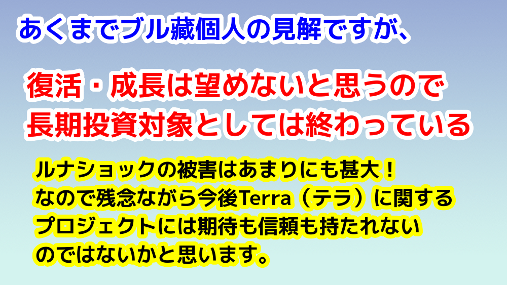 Terraは元々ステーブルコインを発行することを主目的としたプロジェクトですから、その主軸がこれだけ派手に破綻した以上、このプロジェクトは既に終わっていると私は思います。