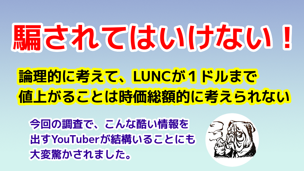 あと「LUNCが1ドルに戻ったら億り人」という煽りに近い動画を上げているYouTuberさんもよく目にしますけど、大変申し訳ありませんが、この情報を上げているユーチューバーさんはちゃんと勉強しているのかと、疑いたくなってしまいますね。